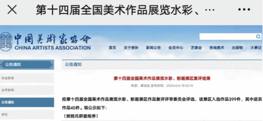 全国美术作品展作品评选非常严格。本届在全国范围内投稿的8000多件水彩、粉画类作品中只有738件通过初选,其中又复评出399件入选全国美术作品展。饶进老师的作品,以其独特的艺术风格和深厚的艺术底蕴脱颖而出,是四川省仅有的2件水彩、粉画入选作品之一。