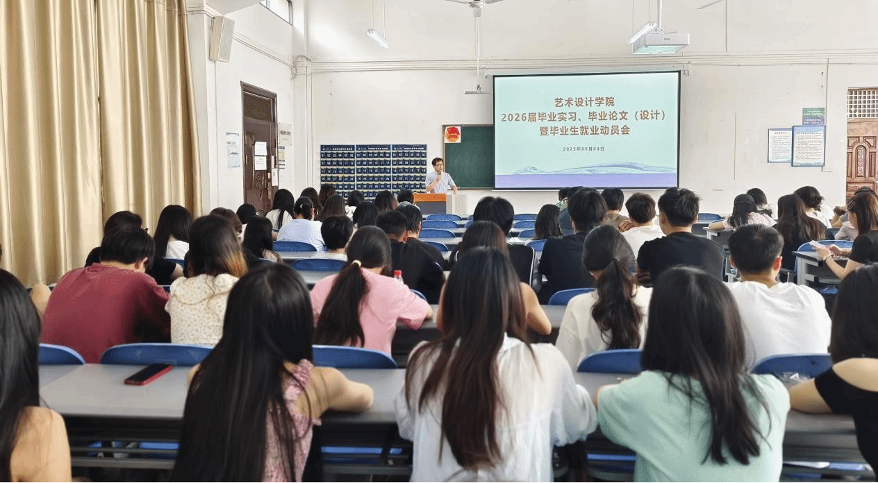 2025年6月4日下午14:30,艺术设计学院在B区学术报告厅、四教楼202分批召开2026届毕业实习、毕业论文(设计)暨毕业生就业动员大会。艺术设计学院领导、各专业教研室主任、教学办公室全体工作人员、2026届毕业实习指导教师、毕业班级专(兼)职辅导员及2026届全体学生参加此次会议。