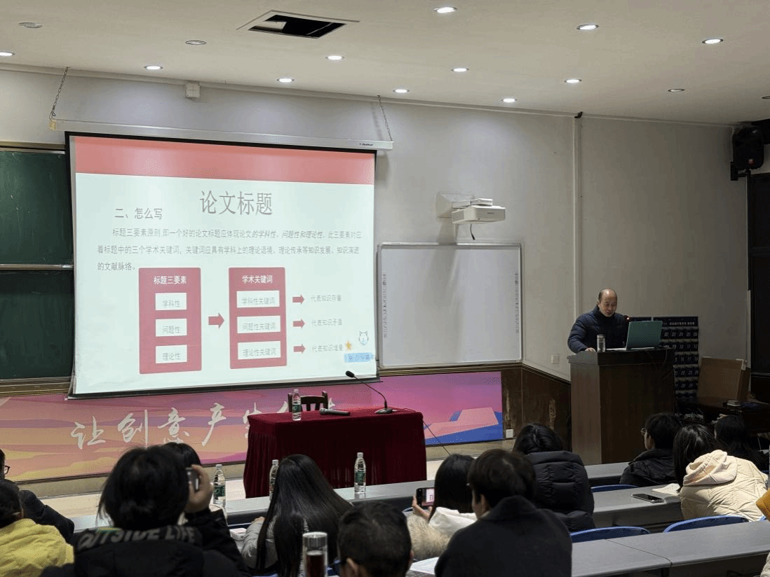 讲座中,陶旭泉教授从课题申报、论文撰写以及逻辑思维三个方面进行了详细讲解。他特别强调了选题的重要性,指出好的研究选题应具有创新性、可行性和社会价值。在论文写作方面,讲解了如何构思和撰写各个部分,如标题、摘要和引言,并强调了一个清晰、准确的标题和简洁明了的摘要的重要性。此外,讲座还深入探讨了逻辑思维在学术研究中的应用,包括归纳与演绎的方法、分析与综合的技巧,以及正确理解和运用概念的重要性。
