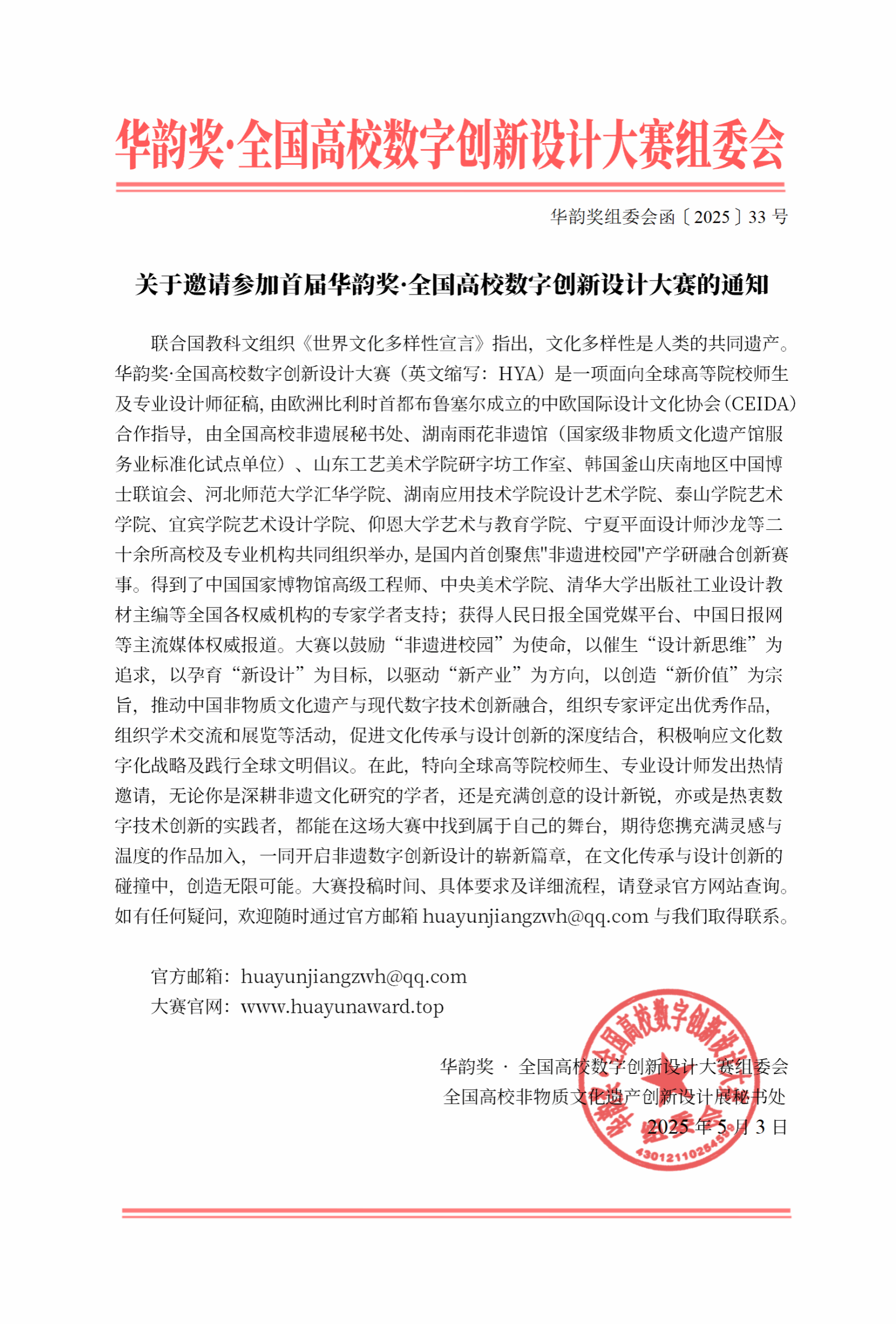 华韵奖·全国高校数字创新设计大赛(英文缩写:HYA)是一项面向全球高等院校师生及专业设计师征稿,由欧洲比利时成立的中欧国际设计文化协会(CEIDA)合作指导,由全国高校非遗展秘书处、湖南雨花非遗馆(国家级非物质文化遗产馆服务业标准化试点单位)、山东工艺美术学院研字坊工作室、韩国釜山庆南地区中国博士联谊会、河北师范大学汇华学院、湖南应用技术学院设计艺术学院、泰山学院艺术学院、宜宾学院艺术设计学院、仰恩大学艺术与教育学院、宁夏平面设计师沙龙等二十余所高校及专业机构共同组织举办,是国内首创聚焦"非遗进校园"产学研融合创新赛事。得到了中国国家博物馆高级工程师、中央美术学院、清华大学出版社工业设计教材主编等全国各权威机构的专家学者支持;获得人民日报全国党媒平台、中国日报网等主流媒体权威报道。大赛以鼓励“非遗进校园”为使命,以催生“设计新思维”为追求,以孕育“新设计”为目标,以驱动“新产业”为方向,以创造“新价值”为宗旨,推动中国非物质文化遗产与现代数字技术创新融合,组织专家评定优秀作品,组织学术交流和展览等活动,促进文化传承与设计创新结合,积极响应文化数字化战略及全球文明倡议。