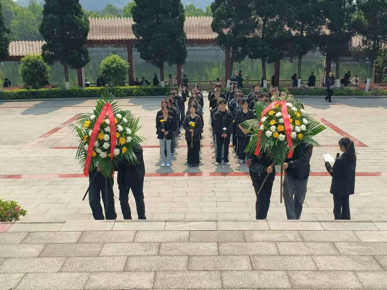 活动现场,全体人员在革命烈士纪念碑前默哀。学生代表敬献花篮,表达对革命先烈的崇高敬业,缅怀革命烈士的不朽功勋。学生代表向涛发言,向为民族独立、人民解放献出生命的英烈致以最深切缅怀。全体师生神情庄重,有序绕纪念碑缓行,瞻仰革命烈士纪念碑、烈士墓,敬献鲜花,寄托哀思。