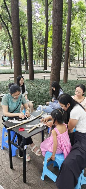王莎介绍了中国传统编织的历史渊源和文化特色,通过精美的图片和生动的讲解,让大家对编织有了初步的认识。随后,纤维艺术工作室成员们为每位参与者分发了编织材料,并进行了详细的示范教学。体验者们表现出了极高的热情和好奇心,认真地跟着步骤操作。“即使学员零基础,也能通过模块化教学快速上手,让编织走进日常生活。”