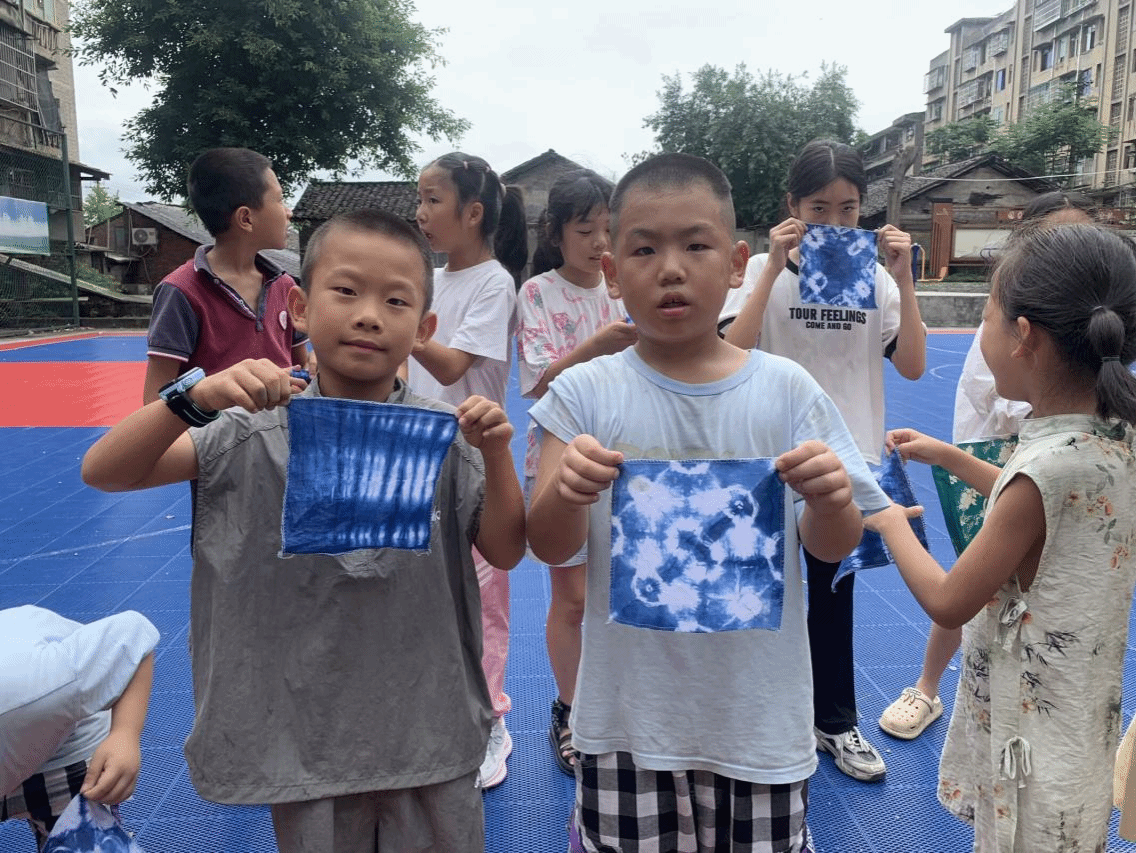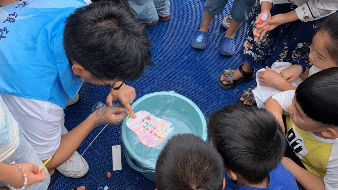 “悠悠夏日,不‘漆’而遇”非遗体验课中,孩子们将素白扇面缓缓浸入漂漆水缸,轻轻旋转,斑斓纹样跃然眼前;扎染课堂上,棉布捆扎浸染,纹路天开。一把把独一无二的漆扇、一块块创意十足的扎染手帕,成为孩子们与千年技艺对话的见证。