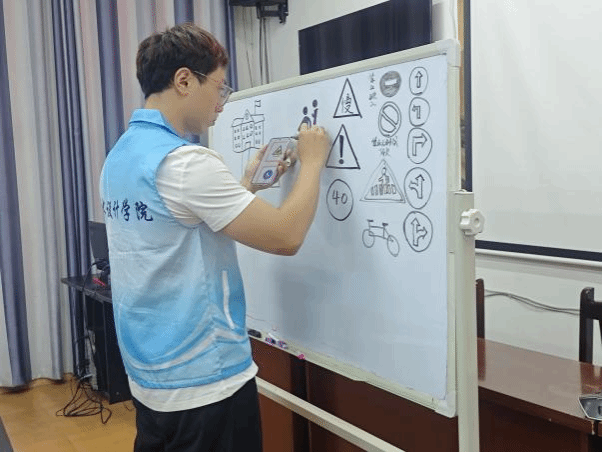 安全教育同样精彩纷呈。志愿者结合动画短片与情景演示,用“六不两会”口诀传授防溺水知识,通过“高温红绿灯”小游戏讲解防暑妙招,还以“斑马线实验”模拟路口,让孩子们体验“一停二看三通过”,并指导绘制交通安全标识,让安全知识入脑入心。