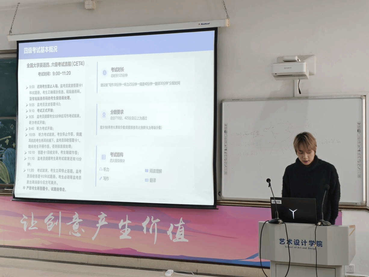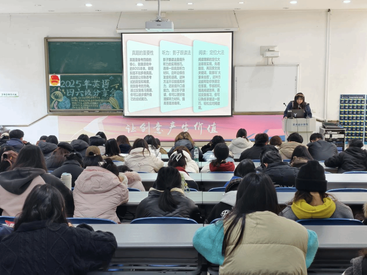 为切实助力学生攻克大学英语四六级考试难关,夯实英语学习基础,提升语言应用能力,11月20日,艺术设计学院在学术报告厅成功举办四六级经验分享交流会。本次活动是学院聚焦学生学业发展需求、落实育人服务举措的重要实践,吸引了150余名各年级学生到场参与。