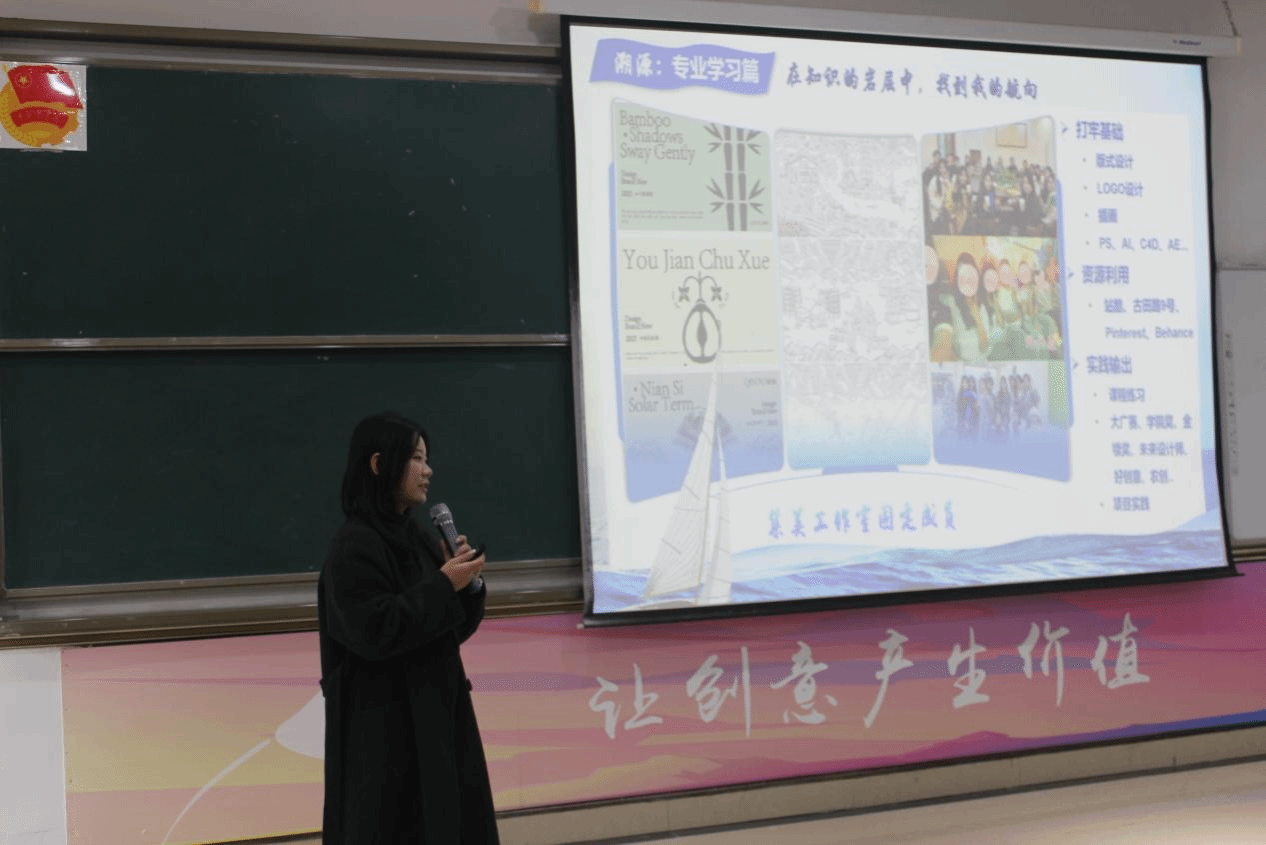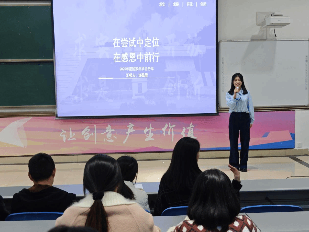林德峰认为学习是一个积累的过程,必须全力以赴,鼓励师弟师妹们注重平时的学习积累,奋力拼搏,勇毅前行。马建英从自身成长出发,分享了大学期间的所思所想所悟以及自身的成长与改变,鼓励师弟师妹们勇于尝试、敢于突破。刘雨婷重点讲述了专业学习积累的过程和社会实践能力的提高,她提出专业学习从打牢基础到整合资源到实践检验的成长路径,分享了参与社会实践的渠道,鼓励大家发挥团队协作精神,在实践中一步一步成长起来。许雅倩分享了“四象限法则”的时间管理法则,从时间管理入手建议大家有效利用大学时光,在专业审美提升与专业知识自学两方面提出建议,鼓励大家脚踏实地,循序渐进,逐步成长。王菊分享了了解国家奖助学金政策的途径,表达了作为受助学子的感恩之情,立志回馈社会。