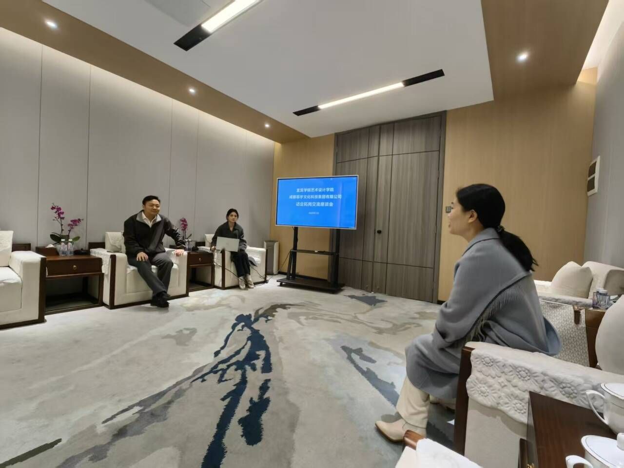 座谈会上,菲宇集团商务总监李学磊详细介绍了企业的发展历程、核心业务板块、人才需求结构及未来战略规划,重点分享了企业在短视频内容生产、品牌数字化营销等领域的实践成果。张利代表学院衷心感谢菲宇集团的热情接待,介绍了宜宾学院的办学历程、治校理念等概况,以及艺术设计学院专业设置、人才培养及2026届毕业生基本情况。双方围绕毕业生就业创业、人才培养精准适配、实习实训基地建设等内容展开深入探讨,希望在实习实训基地建设、科研项目合作、专家进校讲座、毕业设计联合指导等领域深化联动,共同破解人才供给与产业需求的衔接难题。