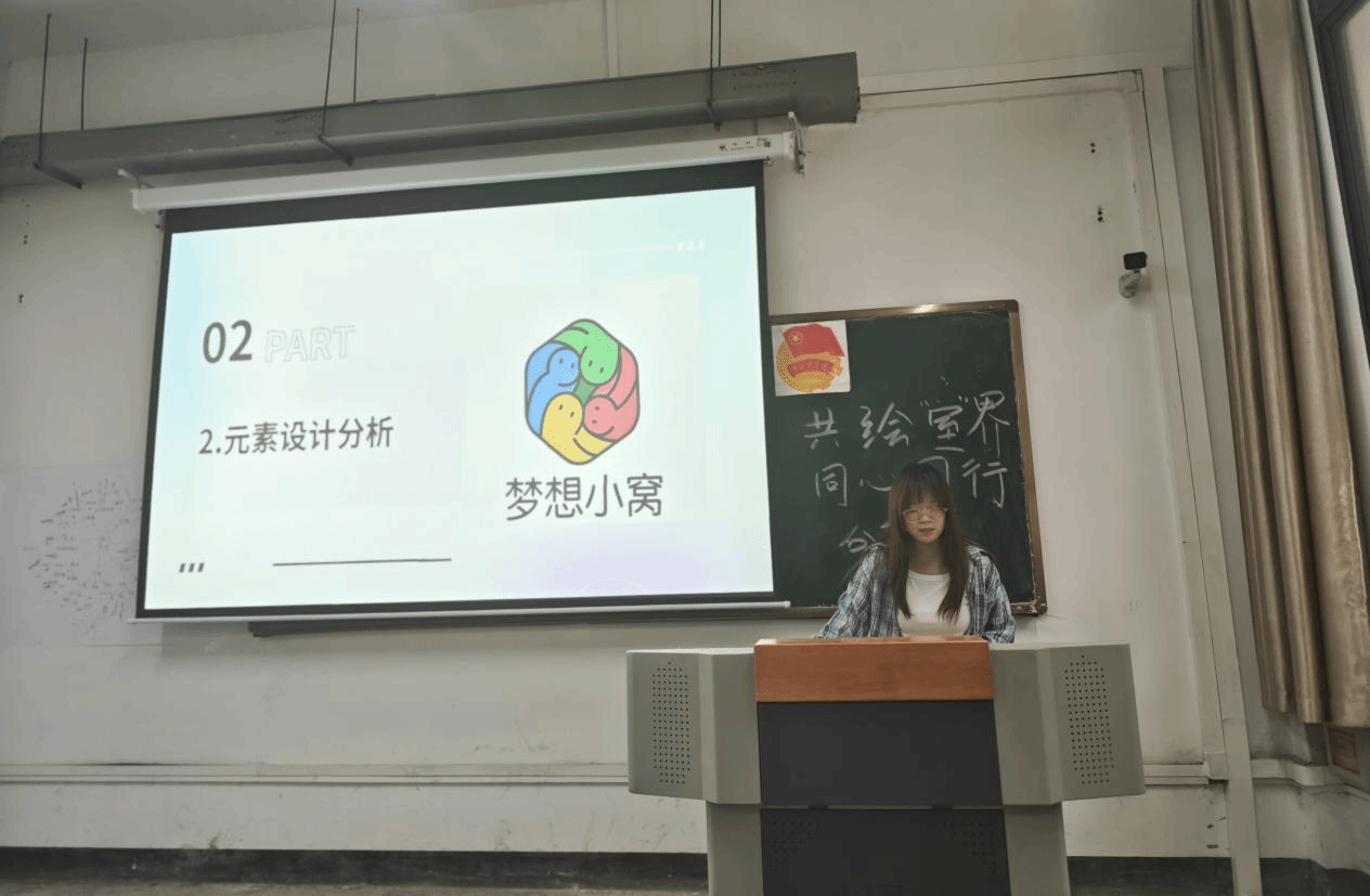 分享会上,各作品创作代表分享了作品的创作理念与感想以及创作过程。陈蝶同学的作品《LOVE HOUSE爱小屋》旨在表达寝室是一个充满爱与关怀的地方,将房屋、爱心、画板和画笔等图案和创意的想法巧妙融合,创造了一份富有爱与温暖的作品,让每一位成员都能感受到温馨和舒适。杨艺茹等同学的作品《梦想小窝》用几何图形和不同的颜色打造出一份梦想中的小窝,彰显出寝室成员情谊与梦想的美好寄托。“五十六个民族要像石榴籽一样紧紧抱在一起”,万杨等同学的作品《榴籽相拥 艺舍同心》形象地表达了这一理念,来自五湖四海的室友也是如此,凝心聚力,共同进步。罗秦铌等同学的作品《宜舍》以宜宾学院校徽为灵感,融合房屋、橄榄枝、手等元素,整体设计融合学校特色,寓意宿舍温情文化与美好愿景。