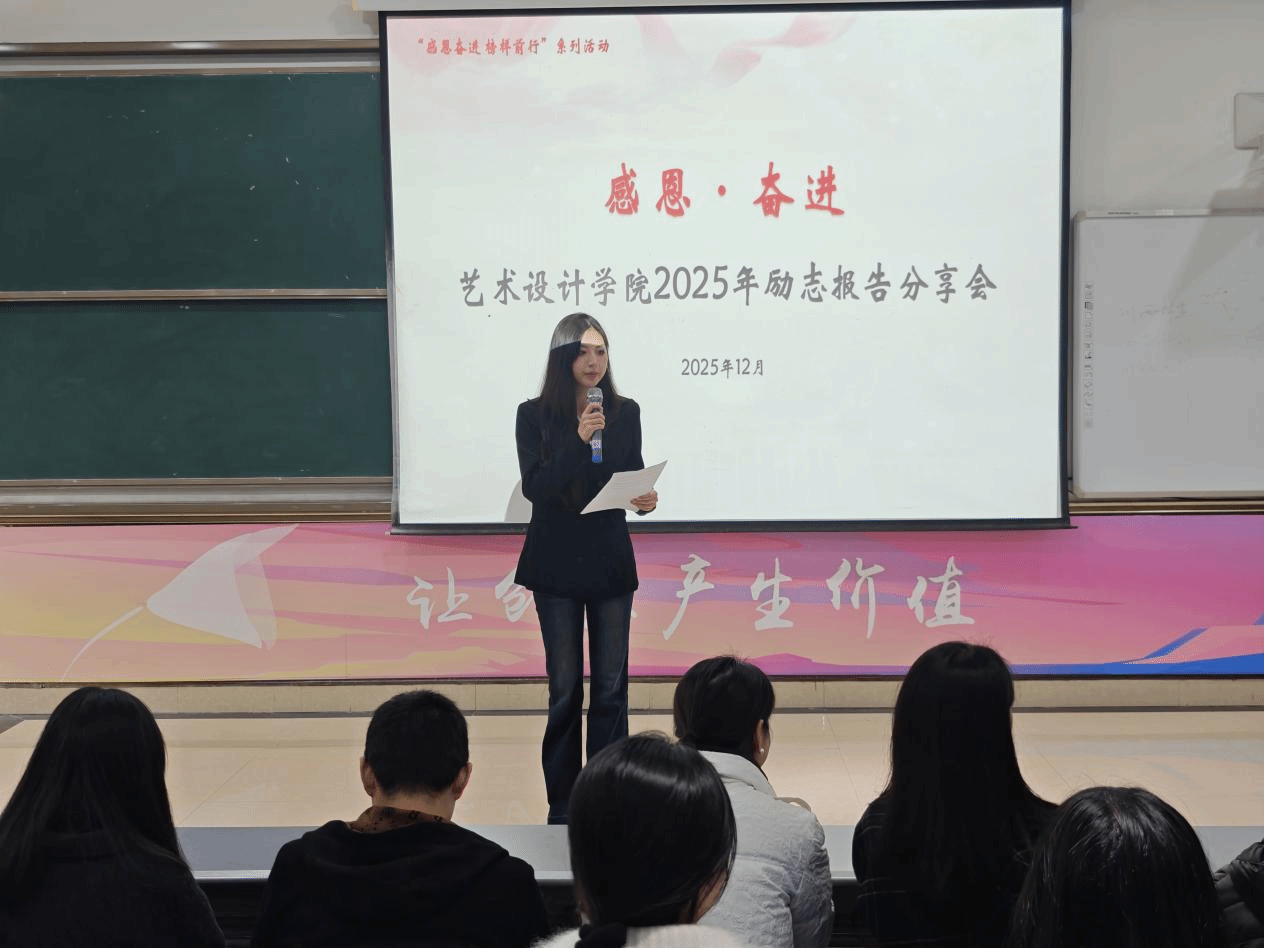 为贯彻落实国家资助政策,加强学生感恩励志教育,有效发挥优秀学子的示范引领作用,切实提升资助育人成效,12月14日,艺术设计学院在B区学术报告厅举行了2025年“感恩·奋进”励志报告分享会。艺术设计学院学生工作分管领导张蕾、全体专兼职辅导员与部分学生代表参会。