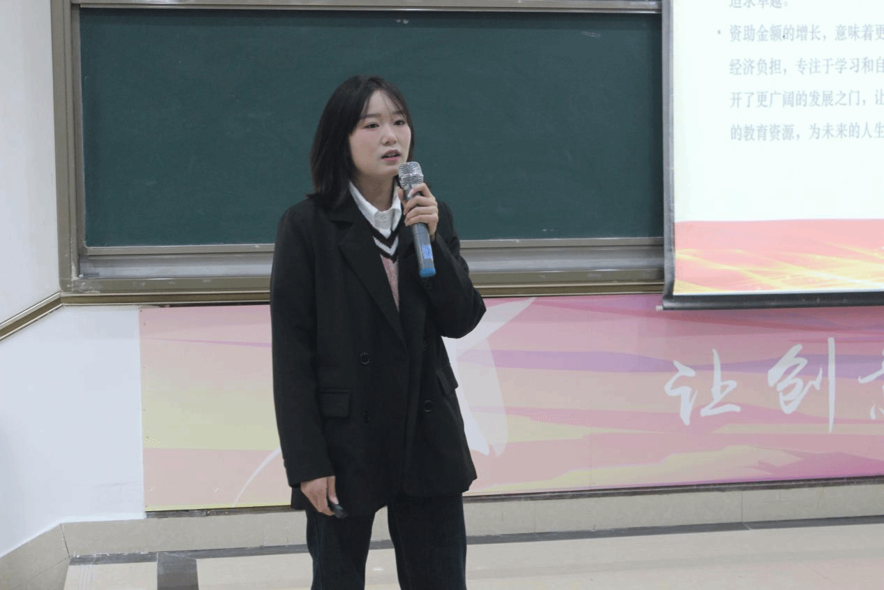 林德峰认为学习是一个积累的过程,必须全力以赴,鼓励师弟师妹们注重平时的学习积累,奋力拼搏,勇毅前行。马建英从自身成长出发,分享了大学期间的所思所想所悟以及自身的成长与改变,鼓励师弟师妹们勇于尝试、敢于突破。刘雨婷重点讲述了专业学习积累的过程和社会实践能力的提高,她提出专业学习从打牢基础到整合资源到实践检验的成长路径,分享了参与社会实践的渠道,鼓励大家发挥团队协作精神,在实践中一步一步成长起来。许雅倩分享了“四象限法则”的时间管理法则,从时间管理入手建议大家有效利用大学时光,在专业审美提升与专业知识自学两方面提出建议,鼓励大家脚踏实地,循序渐进,逐步成长。王菊分享了了解国家奖助学金政策的途径,表达了作为受助学子的感恩之情,立志回馈社会。