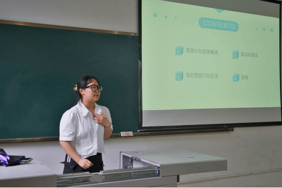 在本次专题宣讲会上,陈其丽从基本情况、考情分析、工作开展、个人建议等四个部分结合自身个人经历,分享自身在西部计划的工作经历,为同学们描绘了一个精彩纷呈的西部生活。并向同学们对西部计划的具体内容、服务项目、报名基本要求、招募程序、激励政策、保障政策等方面进行了详细的讲解,随后又深入解读了西部计划的政策内容和服务期限,并强调了西部计划的报名时间、报名条件和报名方式。鼓励同学们积极参与西部计划,到祖国最需要的地方去,为西部地区的发展贡献自己的力量。