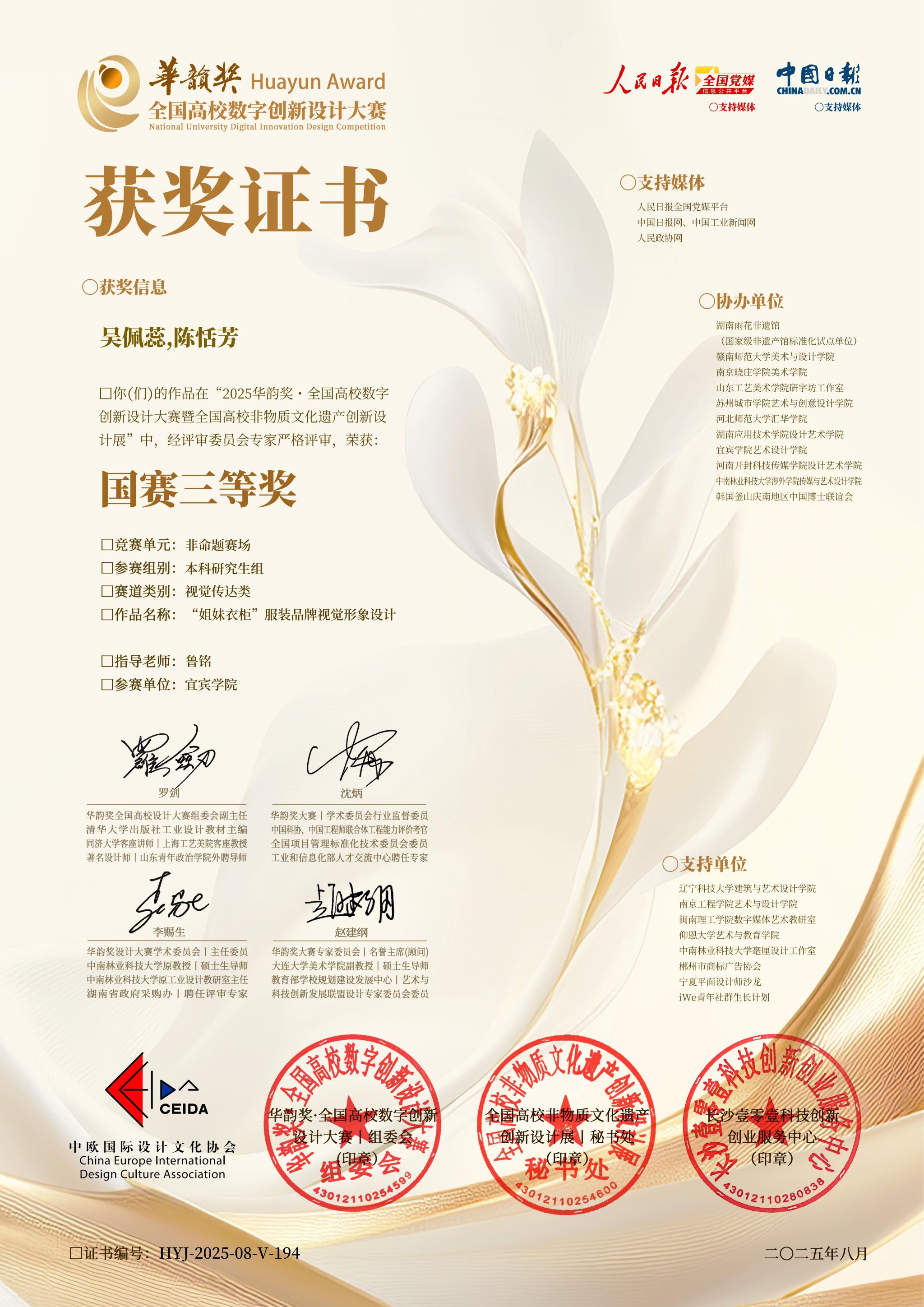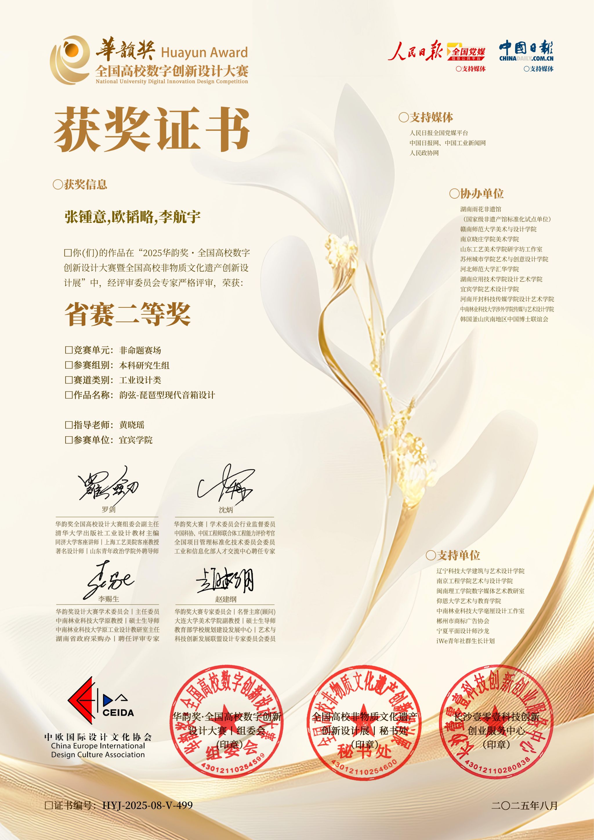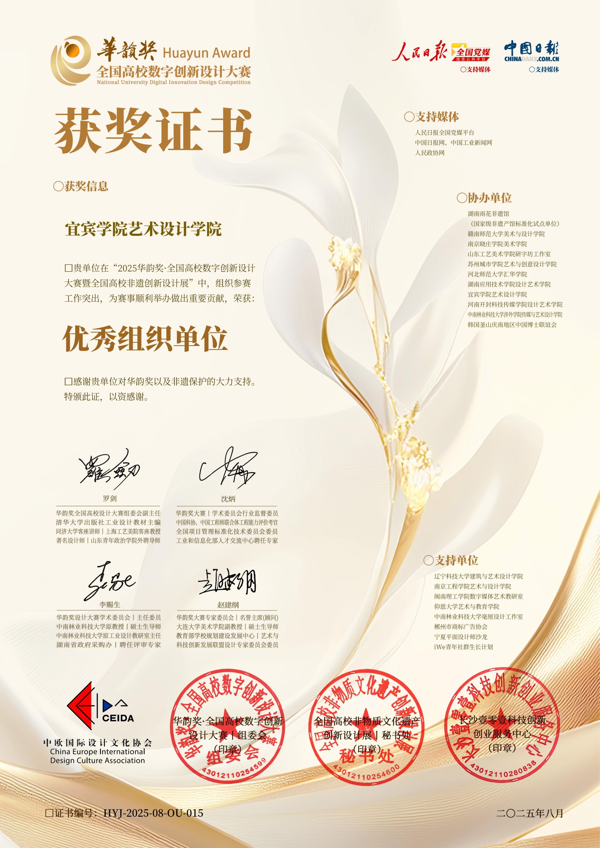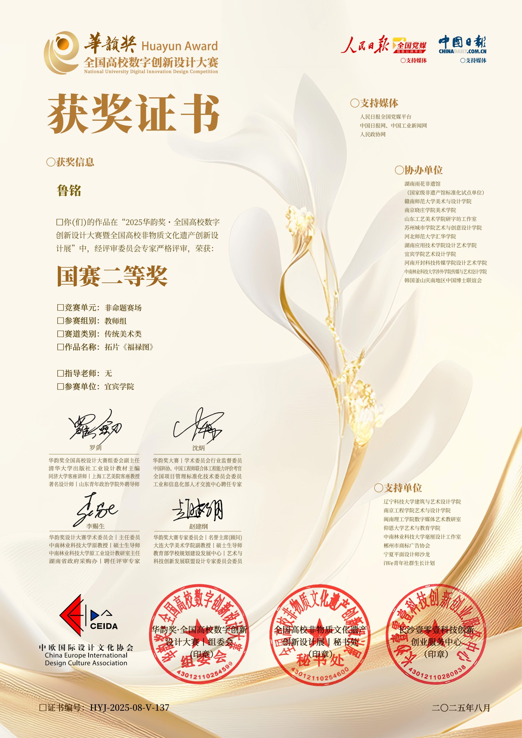 自比赛开启以来,艺术设计学院作为协办单位之一积极组织动员师生参加,共计获得国赛教师组二等奖1项,学生组国赛三等奖1项,学省赛一等奖2项,省赛二等奖4项,省赛三等奖5项。宜宾学院与清华大学、中央美术学院、澳门科技大学等30所院校获优秀组织单位荣誉。